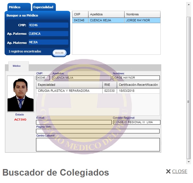 El Dr. Jorge Cuenca Mejía cuenta con el grado de Médico Cirujano siendo miembro del Colegio Médico del Perú con CMP: 43346. Es también Cirujano Plástico recertificado con Registro Nacional de Especialista Nº 23330, y también es miembro aspirante de la Sociedad Peruana de Cirugía Plástica.